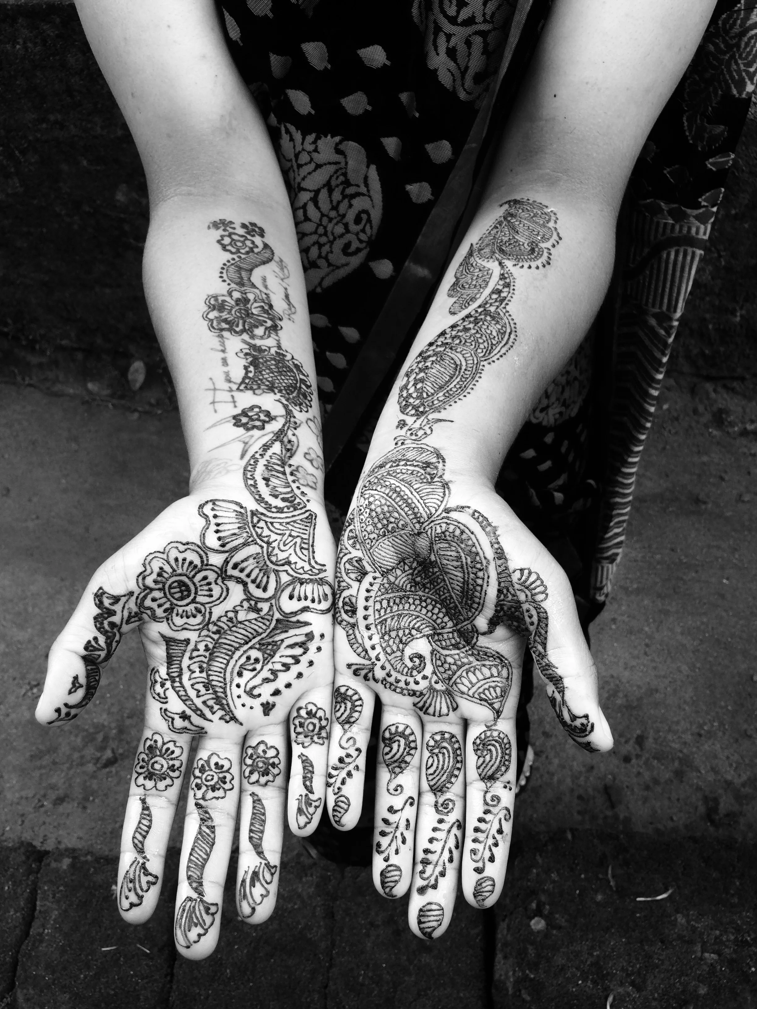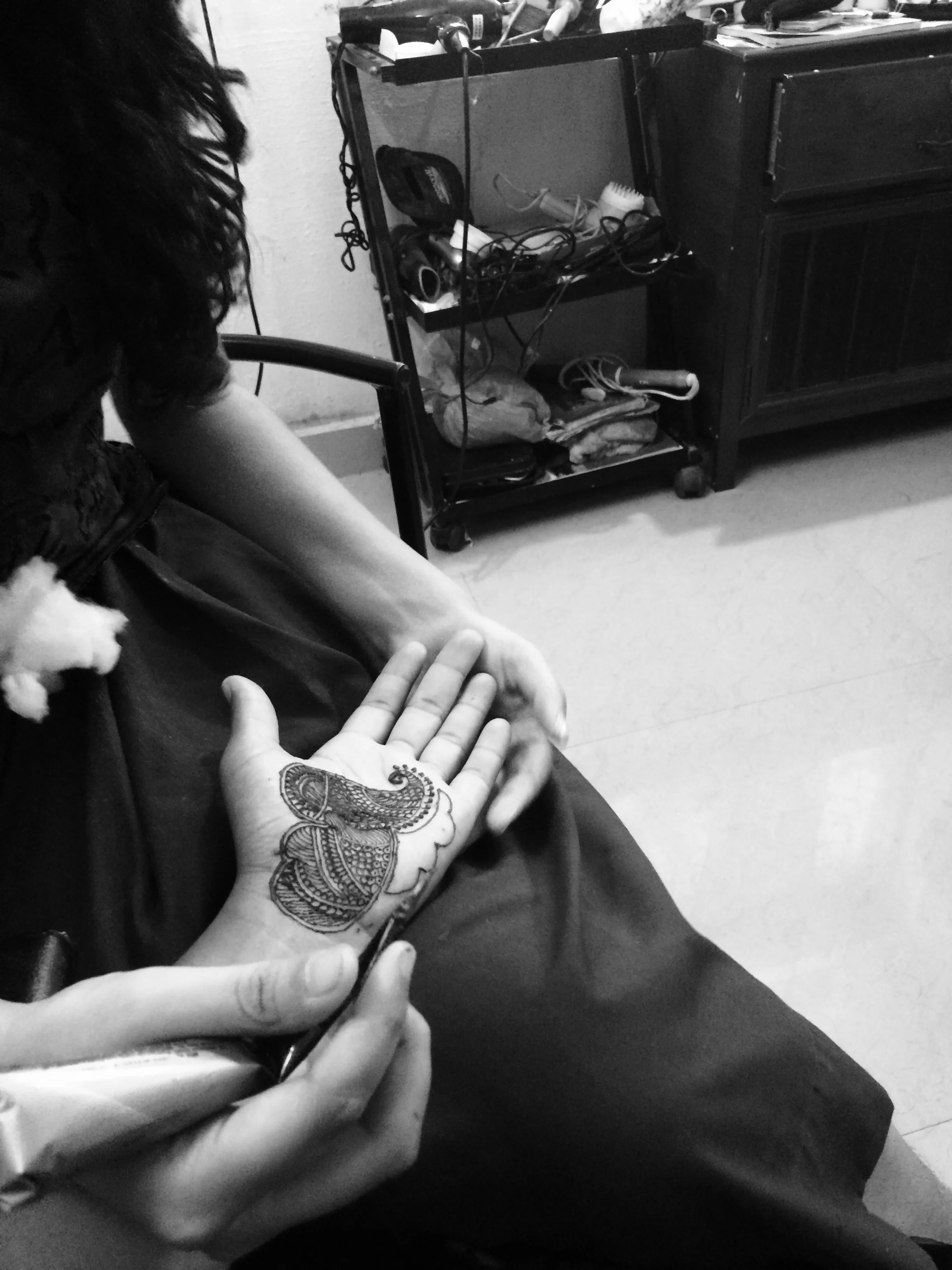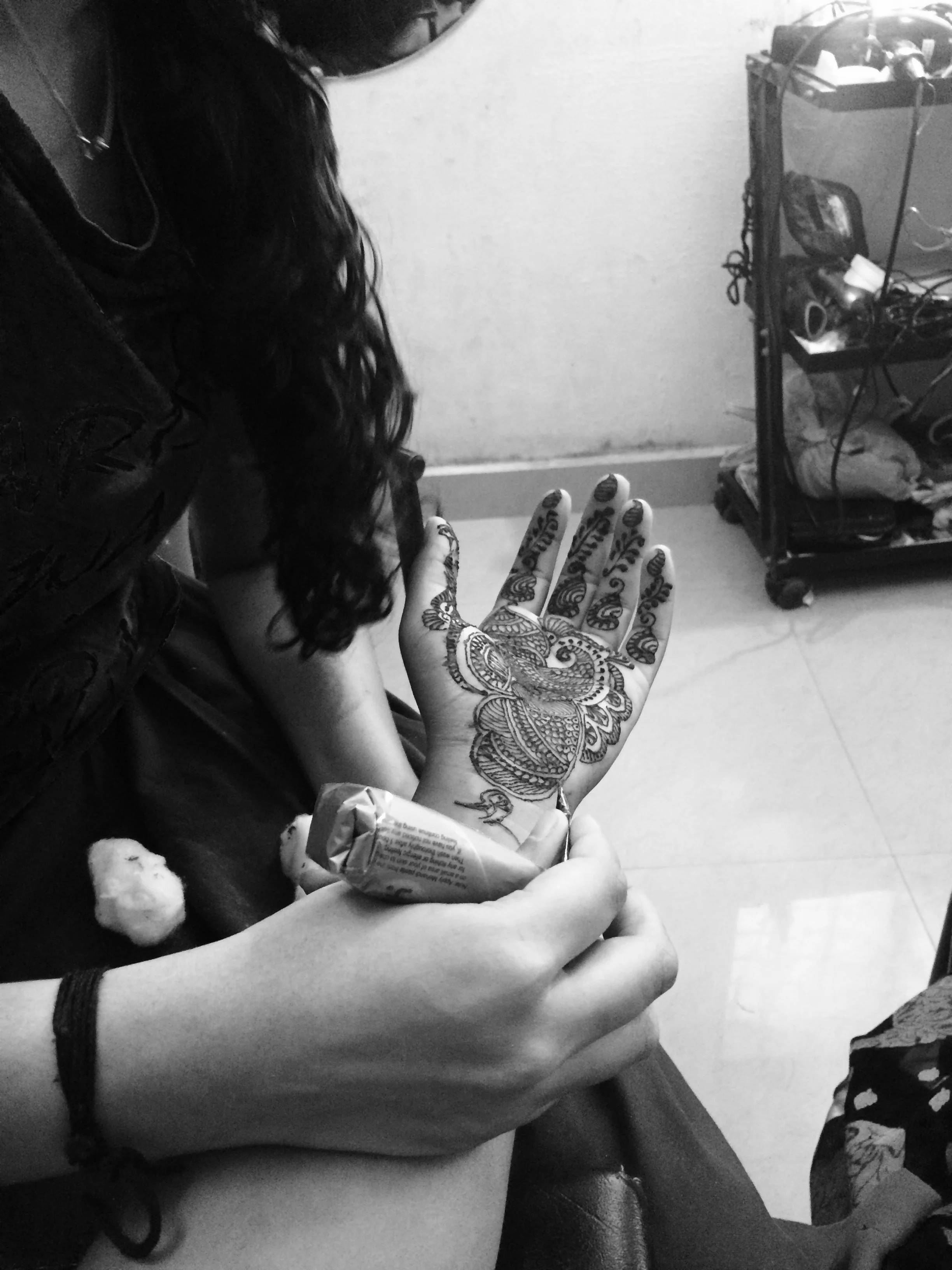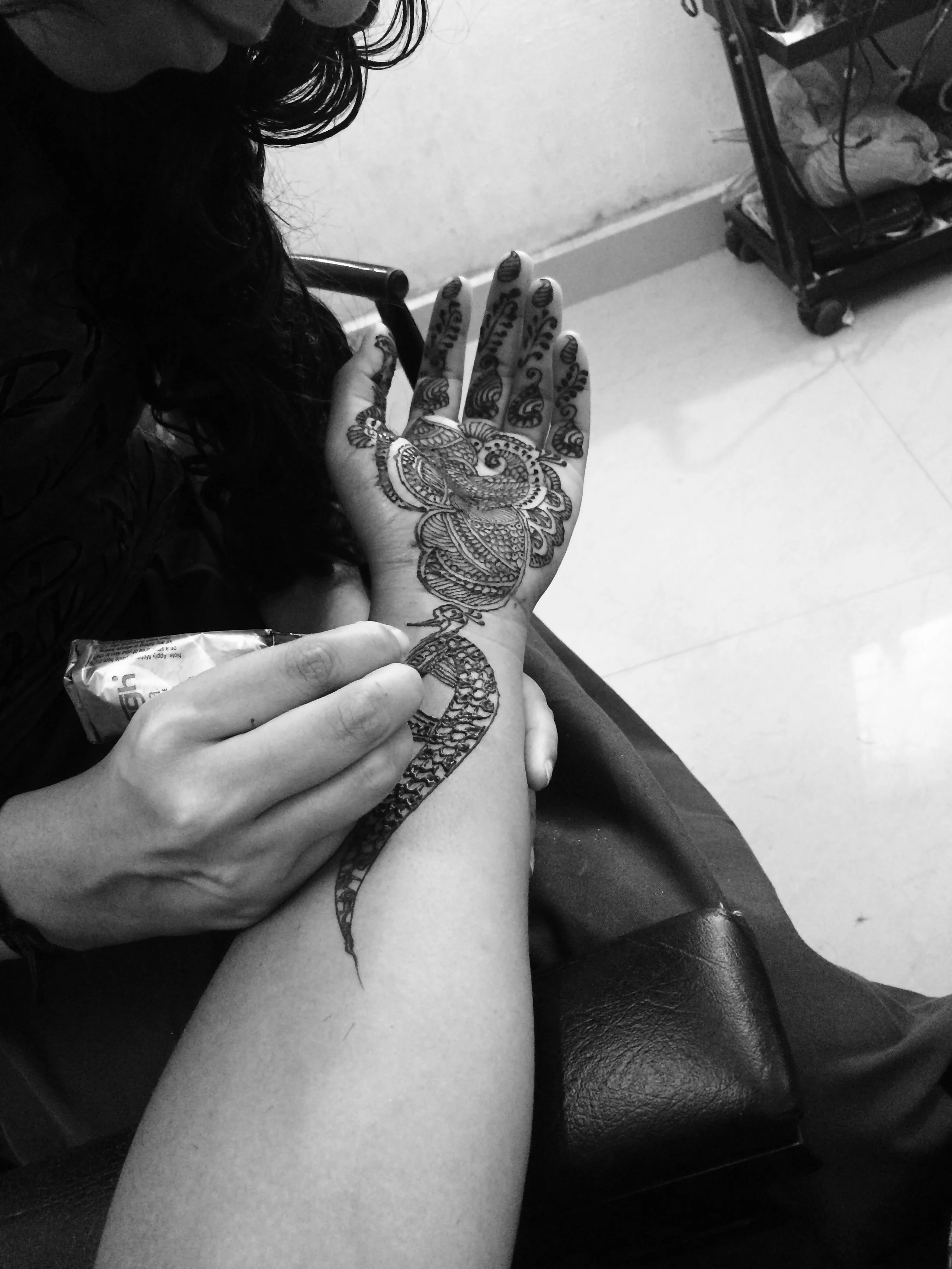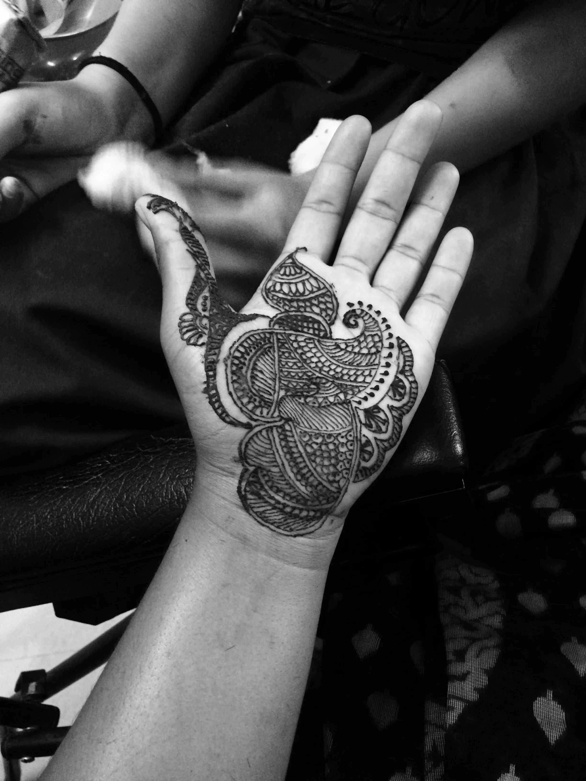 I have always been in love with the henna designs I've seen on Indian women so I decided that since I'm here in India, this would be the perfect opportunity to get henna done on myself. I came to learn that in Kerala the local people call henna, mylanchi. My driver is a local guy here in Kottayam and a neighborhood friend of his happens to own a beauty parlor. By beauty parlor, I mean someone's home with a designated room for all things beauty: hair cutting, coloring, facials, waxing, threading, manicures, pedicures, makeup, mylanchi, face bleaching, and any other beauty ritual you could think of. The owner called a young local girl who couldn't have been more than 16 years old to do my mylanchi. I gave her complete creative control and she came up with beautiful designs I couldn't be more impressed with. The application process took about two and a half hours and she told me to let it dry for six hours. Once it was pretty dry, the owner mixed together some lemon juice and sugar and applied it to the mylanchi assuring me this would make it darker and last longer. It was such a beautiful process to watch her come up with these beautiful designs.